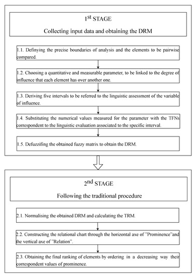 As stated in [23], criteria should be analysed under uncertain conditions when working in vague contexts. Additionally, after stating that decision-making processes are human activities mainly accomplished in uncertain environments, in [24] it is emphasised as the crisp DEMATEL can reflect information only in a partial way. The authors consider the usefulness of applying fuzzy theory to extend the traditional method, so that judgements of preference can be translated into fuzzy numbers, after having been expressed by decision-makers through the adoption of a specific fuzzy linguistic scale.