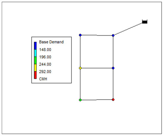 The small network used as the numerical example is known as a two-loop network [38] (Figure 2). This network has six junctions, eight pipes, and one reservoir. Classically, the network is used as a benchmark for optimal design in water distribution systems. For this example, the optimally designed network is used, and a demand curve with residential features has been added. This allows the simulation of the network for 24-h. Leaks are created using emitters node by node. An emitter coefficient equal to 1 has been used, in accordance with [39], which investigated the effects of the emitter coefficient on different geometries and hydraulic head loads to simulate leaks. Observe that the authors established an interval to simulate single leaks varying from 0.5 to 8.