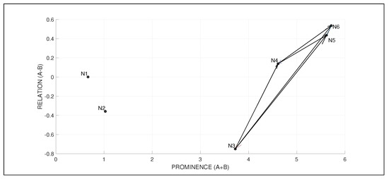 - Building the relational chart on the plane “prominence” (horizontal axis) versus “relation” (vertical axis). Values of prominence () and relation () can be derived from matrix T, by calculating the sums of the rows, A, and the sums of the columns, B:The resulting mapping represents the core of the methodology, since just by observing the positions of the elements in the four quadrants of the plane, it is possible to establish which elements have: (i) high prominence and high relation; (ii) low prominence and low relation; (iii) high prominence and low relation; and (iv) low prominence and high relation. This distinction is very useful to understand how interdependence among the elements is organised, and thus to establish future lines of intervention. Moreover, relations among elements are visually represented by means of arrows: two elements are linked by an arrow if the corresponding value of the TRM overcomes a given threshold, herein calculated by averaging all the values of the TRM [37].