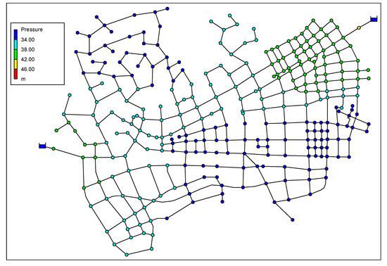 The proposed methodology is applied to the JYN network [40]. The network is composed by 300 nodes and two reservoirs. The mean inlet flow is around 2800 L/s. Figure 4 presents the topology of the network and the mean pressure at the nodes.