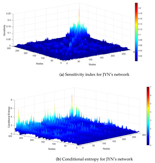Comparison between sensitivity and conditional entropy for JYN’s network. (a) Sensitivity index for JYN’s network; (b) conditional entropy for JYN’s network.