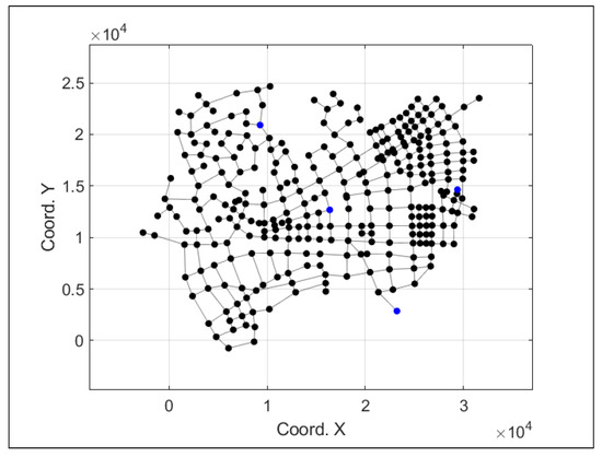 An interesting property related to the hydraulic conditions of the network is that all the sensors are installed in low pressure zones. Usually, low pressure zones are more sensitive to changes in the network, so they have greater sensitivity than other zones. To check the improvement obtained from the use of the conditional entropy with respect to the performance using just the sensitivity matrix, Figure 7 presents the application of the fuzzy DEMATEL method using just the fuzzy sensitivity matrix, for the same scenario with four sensors. The concentration of sensors in the lowest pressure zone of this network can be observed. This zone is also the one identified as the most sensitive by Equation (1). The use of the conditional entropy provides a more widespread distribution of sensors (see Figure 6). Of course, the low pressure zone (excessively) identified by just the sensitivity matrix is not missed when the conditional entropy is used. In addition, this methodology avoids the redundancy of information derived from the concentration of sensors in that low pressure zone, as illustrated in Figure 7, with a more widespread distribution of the four sensors.