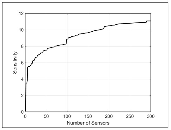 Let us finally emphasise that the relation between the number of sensors and the global sensitivity is a good indicator for decision makers about the number of sensors to be installed. Figure 8 presents the increase of sensitivity with the increase of the number of sensors in the network. The bigger increases for small numbers of sensors, and an asymptotic trend for larger numbers of sensors may be verified. The graph in Figure 8 also shows how by increasing the number of sensors beyond a certain point does not entail a corresponding relevant increase in monitoring.