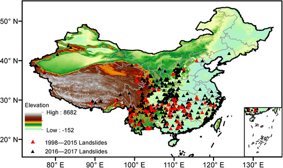 - Li, W.; Liu, C.; Scaioni, M.; Sun, W.; Chen, Y.; Yao, D.; Chen, S.; Hong, Y.; Zhang, K.; Cheng, G. Spatio-temporal analysis and simulation on shallow rainfall-induced landslides in China using landslide susceptibility dynamics and rainfall I-D thresholds. Sci. China Earth Sci. 2017, 60, 720–732. [Google Scholar] [CrossRef]