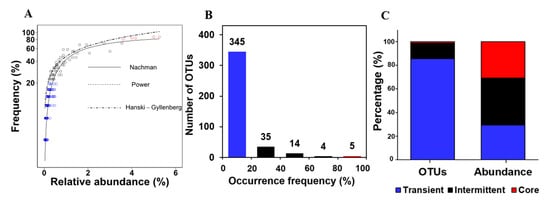Mathematical modeling for the occurrence frequency and abundance of OTUs. (A) Model simulations, using the Nachman, Hanski-Gyllenberg, and Power model are shown. (B) Number of OTUs in relation to occurrence frequency. (C) Average relative abundance of three arbitrary groups: core (occurrence frequency > 80% with red color), intermittent (20–80% with black color), and transient (<20% with blue color).