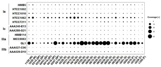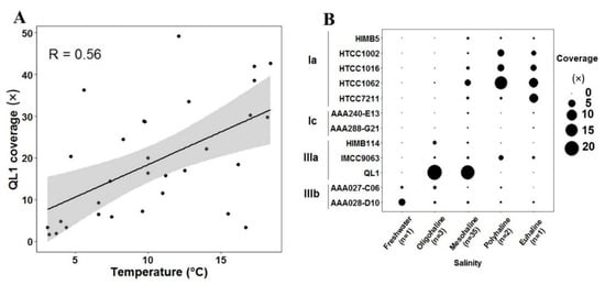 The time-series distribution pattern of the QL1-like population in one same place (LMO) was characterized first. Figure 4 shows the marker gene coverage of the representative SAR11 bacteria over seasons. The temperature in winter and spring (3–7 °C) clearly differed from summer (7–19 °C) (Table S1) in the LMO. Figure S2 shows the seasonal variation of the total SAR11, subclade IIIa, and QL1, respectively, between winter-spring and summer. The total SAR11, subclade IIIa, and QL1 populations were significantly (p < 0.05 by Mann-Whitney U test) enriched in summer. No other SAR11 subclades/species were differentially abundant between the two seasons, suggesting that the differential abundance of the total SAR11 bacteria was attributable to that of subclade IIIa, particularly, QL1. Ordinary least squares regression (OSLR) analysis also suggested that QL1 coverage was positively correlated with the increase of temperature (Pearson correlation = 0.56 with p < 0.05) (Figure 4A).