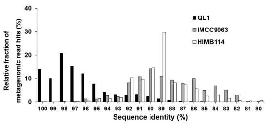 Intrapopulation structure of subclade IIIa. Relative fraction (y-axis) is shown at a given unit of nucleotide identity (x-axis) among the total metagenomic reads mapped on each set of marker genes (QL1, IMCC9063, and HIMB114).