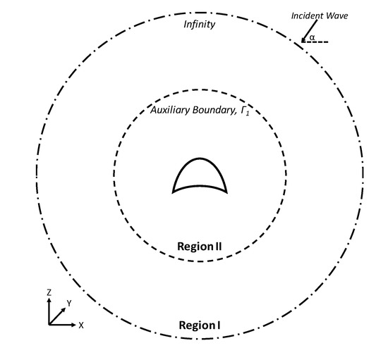 when substituting Equation (4) into Equation (3). Region I is enclosed by the auxiliary boundary and a boundary at infinity. When scattered waves approach infinity, the boundary condition applied at infinity satisfies the Sommerfeld radiation condition: