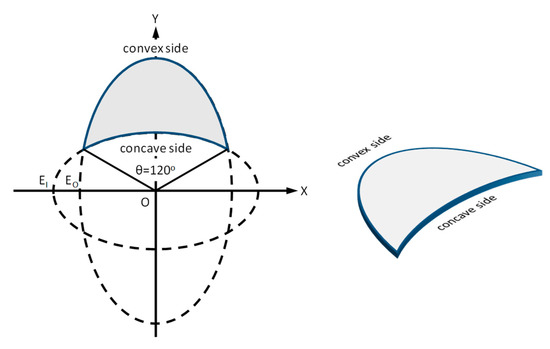 A physical model of the crescent-shaped plate, composed of two orthogonal ellipses with different axes, was built and placed in the wave basin at the Ocean Engineering Laboratory of the National Taiwan Ocean University. The geometric components of the plate are shown in Figure 2. Two orthogonal ellipses, the outer ellipse (EO) and the inner ellipse (EI), overlap at the center, and the lines drawn from the intersections form an angle (θ) of 120°. The major and minor axes of EO and EI are 4.00 m and 2.28 m, and 3.10 m and 1.75 m, respectively; the thickness of the plate is 0.30 m (Table 1).