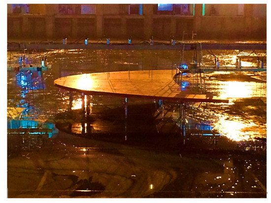 The phenomenon of wave focusing while waves pass the crescent-shaped plate placed 0.2 h below the water surface for the wave condition of at normal incidence can be observed in Figure 4. The waves travel from left to right in Figure 4, and more noticeable wave height can be easily observed during experiments. Such a phenomenon is caused by the combined effects of shoaling, refraction, and diffraction when waves pass the submerged plate.