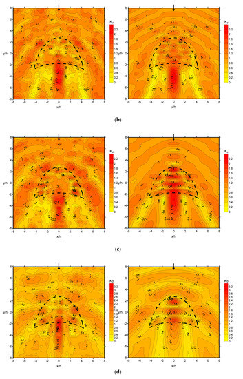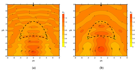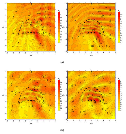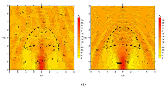 Following the earlier discussions and comparisons of both experimental and numerical results, further investigations of wave focusing at different submerged depths are discussed in this section based on the numerical results. The crescent-shaped plate was submerged to 0.5 h below the free surface, and numerical wave fields for wave conditions of and at normal incidence are presented in Figure 11a and Figure 11b, respectively. Comparison of the numerical wave fields in Figure 11 with those in Figure 5b and Figure 5d, show that the wave field patterns are generally alike, although noticeable decreases in wave-field variation can be observed. This is because the plate is submerged to the depth of 0.5 h, and the effect of the plate on the waves, which causes shoaling, refraction, and diffraction, is weaker than that at 0.2 h. Wave focusing appears behind the plate (concave side) along the wave direction, and the maximum wave height is located differently depending on the wave conditions because of wave refraction; it is farther from the plate for shorter-period waves, and vice versa. In addition, wave focusing is still stronger for the longer period. For instance, the simulated maximum values are 1.47 and 1.50 for wave conditions of and , respectively. Reflected waves in the areas in front of the plate (convex side) can also be detected. The overall simulated values are less than 1.5, which indicates that the effects on wave focusing are less significant when the submerged depth is deeper.