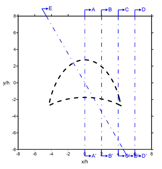 To better compare both experimental and numerical results of derived wave-height ratios , cross-sectional comparison is required. Several cross-sections were defined as shown in Figure 6, including four normal cross-sections A–A′, B–B′, C–C′, and D–D′, representing the locations of cross-sections at 0, 2, 4, and 6, respectively, as well as an oblique cross-section E–E′, which will be discussed later. The comparison of experimental and numerical results of wave-height ratios for wave conditions of and at normal incidence is presented in Figure 7, in which solid lines are numerical results, dots are experimental ones, and the shaded areas indicate where the plates start and end for the given cross-sections. While examining Figure 7a, it can be observed that the numerical and experimental results are mostly in good agreement at different cross-sections from the middle to the far right section. The maximum wave height appears at approximately −4 behind the plate (concave side) because of wave shoaling, refraction, and diffraction, and is more than twice the incident wave height. Similarly, numerical and experimental results are generally in good agreement, except for the results after the origin of coordinates (, where the numerical model underestimated the values, especially at cross-sections A–A′ and B–B′ as shown in Figure 7b. Such underestimation is mainly because of the increasing nonlinearity caused by shoaling for longer-period waves passing over the plate, which could also be observed in the experimental raw data. Nevertheless, the values still serve as an indication describing the wave-focusing phenomenon induced by the crescent-shaped plate. In addition, it can be noted that numerical results are less consistent with the experimental ones within the range where the plate is located, for example, approximately for cross-sections A–A′ and B–B′, as presented in Figure 7. This is because of wave deformation caused by sudden shoaling and the complex wave field above the plate. Nevertheless, the numerical model can describe the spatial patterns of the wave-focusing phenomenon and be employed for possible further investigation of different scenarios.