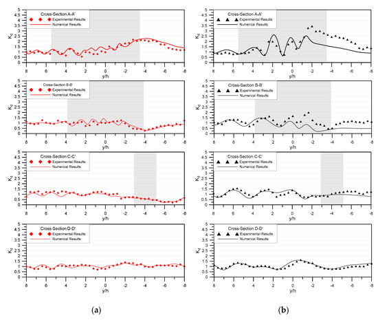 Comparison of the experimental and numerical wave-height ratios at different cross-sections A–A’, B–B’, C–C’, and D–D’ for wave conditions of (a) and (b) at normal incidence. The shaded area indicates where the plate starts and ends for the given cross-section.