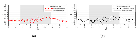 Similar to the previous discussion in Section 4.1, cross-sectional profiles of wave fields along the wave direction were investigated. Figure 9 presents both experimental and numerical wave-height ratios for wave conditions of and at cross-section E–E′, which traverses the coordinate origin along the oblique wave direction. Similarly, Figure 10 depicts both experimental and numerical wave-height ratios for wave conditions of and at cross-section B–B′, located away from the centerline.