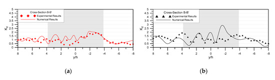 Comparison of the experimental and numerical wave-height ratios at the cross-section B–B′ for wave conditions of (a) and (b) at oblique incidence (. The shaded area indicates where the plate starts and ends for the given cross-section.