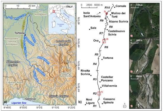 The Scrivia River basin is located in the northwestern sector of Italy (Figure 1a), and it encompasses the territory of three important northern Italian regions: Liguria, Piemonte and Lombardia, spreading over about 1000 km2. The main fluvial stem, i.e., the Scrivia River, has a length of about 90 km and rises in the upper part of the basin, within the territory of the Liguria region, at the confluence between the Laccio and Pentemina creeks. It flows approximately northward receiving all the major tributaries from the right side of the valley (i.e., Borbera River, Brevenna River, Vobbia River, Ossona River and Grue River) up to the confluence with the Po River, the most important and largest Italian watercourse. The Scrivia River and its tributary Borbera River are among the best examples of braided rivers in north-western Italy.