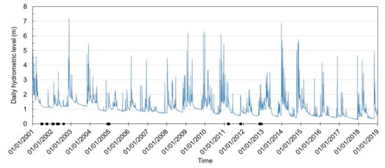 Mean daily hydrometric level measured at the Guazzora gauge station from 2001 to 2018. Black dots on x-axis highlight missing data in the time series. The 2011 extreme flood is not documented.