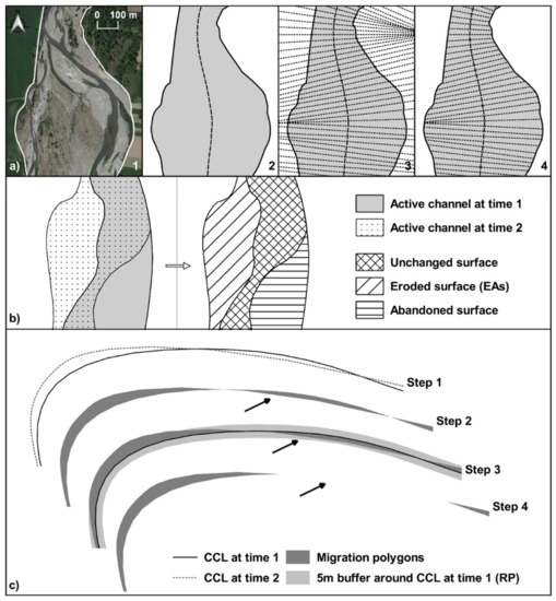 (a) Active channel definition and consecutive steps to evaluate channel width at site scale; see the text for explanation; (b) Polygons for the computation of NCA, PUS, PES and PDS. The superimposition of two active channel polygons resulted into three distinct layers representing (i) the areas belonging to the active channel at both times (i.e., unchanged surface); (ii) the areas converted from floodplain to active channel (i.e., eroded surface–EAs); (iii) the areas converted from active channel to floodplain (i.e., abandoned surface); (c) Procedure adopted in defining migration polygons; the arrow indicates a migration polygon included within the RP and thus not considered for the computation of MR; see the text for explanation.