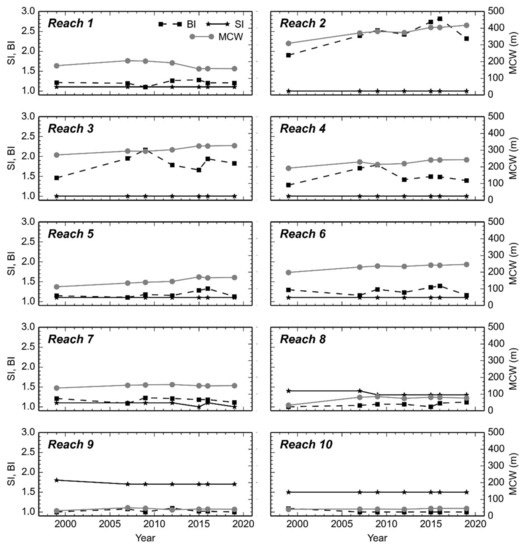 From 1999 to the present day no relevant changes in the SI are documented, except for a slight reduction in reaches 8 and 9 (Figure 4). The BI presents an increase up to 2009 followed by a reduction in reaches 2, 3 and 4, whereas it shows smaller fluctuations in reaches 1, 5 and 6. Moreover, a further common phase of slight BI increase was measured in 2015 and 2016 in reaches 2 to 6, followed again by a reduction up to 2019 in all reaches. In reaches 7 to 10, no relevant changes were measured, and BI remained quite constant, usually slight above 1 or equal to 1 (Figure 4).