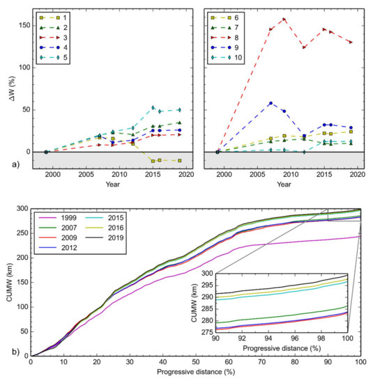 The reach-scale comparison of the percentage differences between the 1999 MCW and each subsequent MCW (∆W) revealed some temporal trends (Figure 5a). A generalized channel widening (i.e., increasing trend) occurred up to 2007 and 2009 in all reaches and in seven out of ten reaches, respectively. Moreover, a further MCW increase is observed in the period 2012-2015, followed by no MCW changes up to 2019. The active channel widening measured between 1999 and 2019 amounts to 20–50% in reaches 2 to 5 and to 10–29% in reaches 6 to 10, with an outlier of 130% recorded in reach 8. The first reach experienced a narrowing (i.e., decreasing trend) of 10.3%. The highest ∆W values were noticed in reaches 5 in 2015 (52.7%), 8 in 2009 (157.6%) and 9 in 2007 (58.1%); in contrast, both reaches 8 and 9 experienced a ∆W reduction from 2009 to 2012. These variations are overall clearly noticeable at the scale of the whole study reach (Figure 5b). In fact, the CUMW at the outlet shows a relevant gap between 1999 and the other measurements, which represents the above-illustrated increase in channel width occurred after 1999. Furthermore, without considering the 1999 CUMW values, two distinct groups of CUMW curves are particularly noticeable (Figure 5b). The former shows CUMW maximum values ranging from 283.5 to 286.4 km and the latter from 296.7 to 299.4 km. They refer to the periods 2007–2012 and 2015–2019, respectively. The evident gap among these two groups of curves highlights that from 2007 to 2019 the riverbed experienced the largest increase in active-channel width between 2012 and 2015. The all CUMW curves follow overall the same trend, highlighting that no large and generalized channel width variations occurred along extensive portions of the study reach. Conversely, abrupt changes in steepness allowed for the identification of intense local-scale channel narrowing processes, for example at 5% of progressive distance, and channel widening processes, at 25%, 46% and 62%.