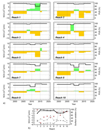However, it should be noted that the first reach shows generally countertrend values indicating a progressive active channel narrowing occurred after 2009 and overall from 2012 to 2015, as illustrated by MCW, ∆W and NCA (Figure 4, Figure 5a and Figure 6a). This is associated with the stabilization of a large surface in the downstream-most part of the reach. Nonetheless, bank retreats are also documented along this reach. The channel planform dynamics outlined by NCA, PES and MR in reaches 8 and 9 between 2007 and 2012 come from channelization works [32,45] (Figure 6 and Figure 7). The highest degree of channel activity has been observed in reach 2 that, in fact, presents widespread bank erosions and that experienced a progressive increase of the active channel width as well. On the contrary, the reaches 9 and 10 can be overall considered the most stable over the investigated time span (Figure 6a and Figure 7). The generalized prevalence of the floodplain-to-channel conversion process in the period 1999-2019 is well-recognizable considering the high and low values of PES and PDS, respectively (Figure 6b). The homogeneous trends of CUMW curves, along with the overall progressive increase of CUMW values over time, highlight that the channel widening has been related to both locally-intense and widely-moderate bank retreats, rather than to very severe ones along the whole study reach.