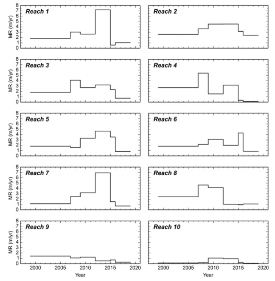 The reach-scale MR referred to each considered period ranges from 0.1 to 7.2 m/year (Figure 7). The highest variations over time were documented in reaches 1, 5 and 7, which present a MR range of 6.6, 5.3 and 6.2 m/year, respectively. The other reaches showed a range between 2.1 and 3.8 m/year, while reaches 9 and 10 are characterized by the lowest range values 1.1 and 1, respectively. The highest MR values can be observed from 2007 to 2016. Taking into account the whole period 1999–2019, the reach-scale MR ranges from 0.25 m/year to 1.9 m/year, in reaches 10 and 7, respectively. Furthermore, values between 1.5 m/year and 1.9 m/year have been measured in reaches 1 to 5, 7 and 8, whereas between 0.25 m/year and 0.9 m/year in reaches 6, 9 and 10.