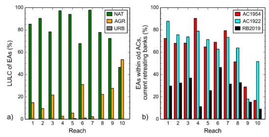 As concerns the relationship between bank retreat processes and LULC of the involved plots of land, Figure 8a depicts the LULC classes distribution of the EAs at reach scale. Most of EAs are NAT, and, in particular, four out of ten and seven out of ten reaches, located mainly in the upper and middle part of the study reach, present values >90% and >75%, respectively. The highest percentages of AGR is registered in reaches 1, 3, 6, and 8 to 10. Substantially, urban areas are not involved in bank retreat processes, except for very small areas in reaches 5 and 6.
