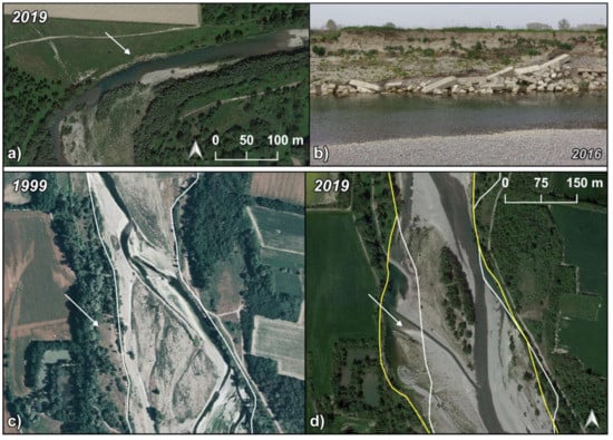 Examples of active channel widening associated with distinct lateral-erosion processes; see the text for explanation. (a, b) High and steep bank presenting a collapsed defense structure; the arrow in (a) indicates the location of (b) (photo by A. Mandarino); (c, d) The arrow in (c) indicates the in-channel modern floodplain formed before 1999 that has been eroded over the last twenty years (d); the white and yellow lines correspond to the 1999 and 2019 banks, respectively.