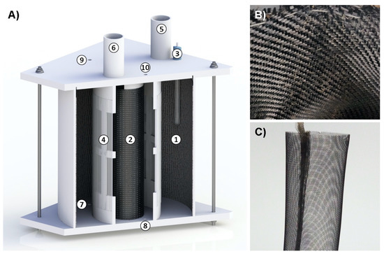 Reactor scheme (A): 1—biocathode; 2—anode; 3—reference electrode; 4—cation exchange membrane; 5, 6—sampling ports of cathode and anode chambers; 7, 8—cathodic and anodic chambers electrolyte inlets; 9, 10—cathodic and anodic chambers electrolyte outlets; (B) biocathode; (C) anode.