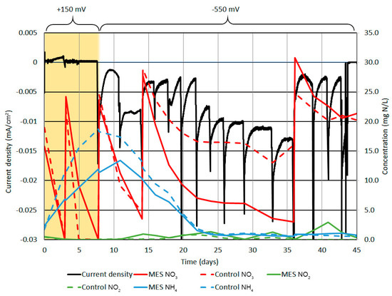 During the inoculation period (days 0–7) when the cathode polarization was posed at +150 mV vs. SCE, the current density showed no changes, although the NO3‾ concentration dropped below the detecting range twice (Figure 2). At the same time, the NH4+ concentration increased and it could have been caused by ammonification (3) or dissimilatory nitrate reduction to ammonium (DNRA) (4) [10,24,40]. It is possible that the initial drop in NO3‾ could have been caused not just by denitrification but also by DNRA and anammox (5) [40]. However, it was the same in both reactors so the use of polarization did not seem to have an effect.