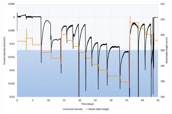 Current density was significantly correlated with the water level (p = 0.013; r2 = 0.411). As shown in Figure 3, the cathodic current density was higher when the water level was lower. As the cathode was able to reduce O2, it can be said that the increase of current density was caused by the reduction of O2 on the electrode. When the water level dropped, more O2 was present in the system, resulting higher cathodic current density. Statistical analyses also show a significant correlation (p = 0.048; r2 = 0.286) between the DO concentration and current density. Water table height had a better correlation than DO concentration because the latter does not include the effect of the electrode being exposed to the gaseous phase. When the water table height was lower than 200 mm, the upper part of the electrode was exposed to the gaseous phase and more oxygen was able to be in contact with the electrode, resulting in an increase in the current density.