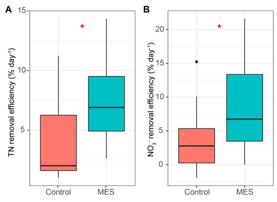 Total nitrogen (A) and NO3‾ (B) removal efficiencies per day (% day−1). Median, min/max, 25% and 75% quartile values are presented. The asterisks denote statistically significant differences between the MES and control reactors * p < 0.05.