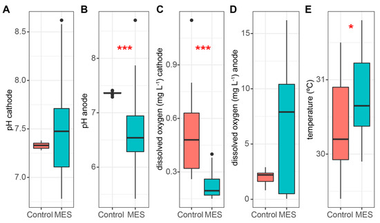 pH in the cathode chamber (A), pH in the anode chamber (B), dissolved oxygen concentration in the cathode chamber (C), dissolved oxygen concentration in the anode chamber (D), and temperature in the cathode chamber (E). Median, min/max, 25% and 75% quartile values are presented. The asterisks denote statistically significant differences between the MES and control reactors * p < 0.05; *** p < 0.001.