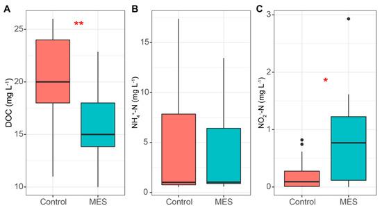 DOC (A), NH4+ (B), and NO2‾ (C) concentrations in the MES and control reactors. Median, min/max, 25% and 75% quartile values are presented. The asterisks denote statistically significant differences between the MES and control reactors * p < 0.05; ** p < 0.01.