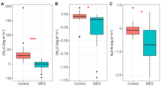 CO2 (A), CH4 (B) and N2O (C) gas fluxes in the MES and control reactors. Median, min/max, 25% and 75% quartile values are presented. The asterisks denote statistically significant differences between the MES and control reactors * p < 0.05; *** p > 0.001.