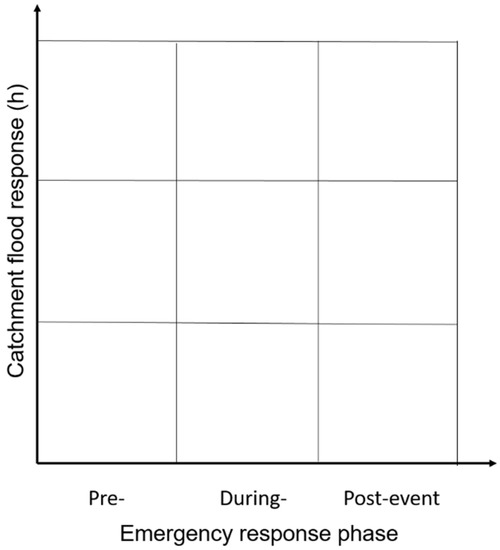 Catchment flood response was chosen as one of the key factors because this gives an indication of the time available to deploy an UAS and the use of particular applications and technologies in a given situation. The catchment flood response was determined based on the time between the start of a rainfall event and the potential for the flooding of properties. Based on climatic and catchment conditions in England, the flood response was considered to be ‘slow‘ when flooding occurs more than 8 h after the rain event, ‘medium’ when flooding occurs between 3 and 8 h and ‘fast’ when the onset of flooding takes place in less than 3 h [25,26]. We also considered in the deployment analysis matrix the phase in which UAS will be deployed in the overall approach to flood risk management activities [27]: ‘pre-event’, ‘during-event’ and ‘post-event’ (Figure 1). Pre-event refers to activities such as flood modelling activities, the construction of flood risk reduction assets and the planning that will be needed to respond effectively to a defined flood magnitude (i.e., based on a return period). During-event starts as soon as the first flood warning is issued, whilst post-event refers to the recovery and clean-up phase when the water has receded and for example is no longer within people’s houses or blocking transport routes.