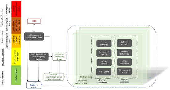 Schematic diagram of flood emergency response in England showing the main agencies and groups involved, the levels of emergency responses at the local level (operational, tactical, strategic), the categories of responding organizations (Category 1 and Category 2) and the likely government arrangements (from local response to central direction from COBR) which depends upon flood extent (local, regional, cross-region and national). Category 1 comprises the organizations that are at the core of the response to most emergencies, whereas Category 2 responders are co-operating bodies involved in incidents that affect their sector. The color schemes in the government arrangements reflect the increasing levels of emergency response (from green to red). COBR: Cabinet Office Briefing Rooms, Defra: Department for Environment, Food and Rural Affairs, MHCLG: Ministry of Housing, Communities and Local Government, RED: Resilience and Emergency Division, and LGD: Lead Government Department.