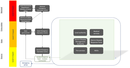 India also has a tiered approach to flood emergency response (Figure 3). The national government develops policies and provides advice and assistance when there are major events, whilst the States are the responsible for carrying out risk assessments and planning and implementing mitigation measures [8]. At the district level, flood events are categorized into three levels of impact [38]: Level 1—there are sufficient resources and capacity to respond at the district level; Level 2—the impact is beyond existing capacities and support from State agencies is needed; and Level 3—the impact is beyond the existing capacities of district and state resources and support from national agencies is needed (Figure 3). If an emergency escalates beyond their capabilities, the local administration must seek assistance from the district administration or the State Government. If the State Government considers it necessary, it can seek central assistance [8]. The Ministry of Water Resources (river flooding) and Ministry of Urban Development (pluvial flooding) function under the overall guidance of the Ministry of Home Affairs [8,39] when responding to flood events.