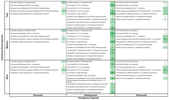 With the limitations of current UAS applications, the updating of evacuation routes was identified as being important only in catchments with a flood response longer than 12 h or where the duration of flooding in a faster responding catchment persists for more than 12 h. Applications that need more than 48 h of processing time, such as modelling flood extent and the identification of resilience and resistance measures, were still identified as being important as the data collected can be used subsequently to improve flood models and the response for future flood events.