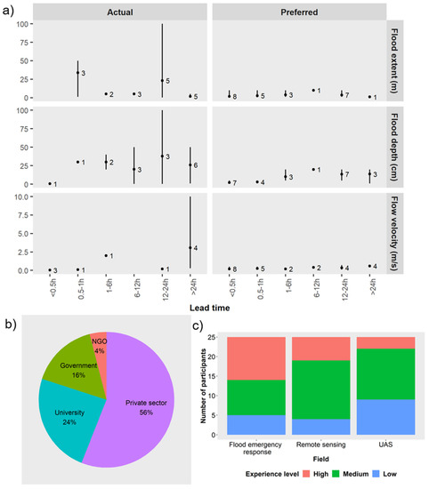 (a) Actual and preferred accuracy values and time needed to process flood extent, flood depth and flow velocity. The marker indicates the average of flood extent, flood depth and flow velocity, whereas the vertical lines shows the minimum and maximum values. The number of participants with a preference for a given combination are indicated against each measure. (b) Type of organizations that completed the survey. (c) Participants’ experience level in flood emergency response, remote sensing and UAS. Results obtained from 25 participants.