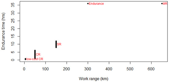 Simplified classification of UAS platforms based on their work range (km) and battery endurance time (h). The different classes include low-cost close-range (CR), close-range (CR), short-range (SR), medium-range (MR) and high-endurance (Endurance) platforms. A full description of these classes is provided in Table 3.