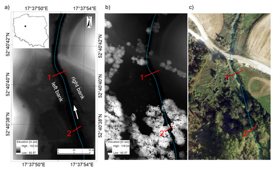 Based on LIDAR data, a DEM of the investigated river reach was developed (Figure 1a), while the location of trees was given in the DSM (Figure 1b). The current vegetation status in the analyzed Wełna River reach is presented in an aerial photograph (Figure 1c). Based on the forest stand description and a forest map, on the right bank of the river reach there is a forest subcompartment of 0.17 ha. Black alder (Alnus glutinosa) is the dominant species. The stand is approximately 70 years old. Common sallow (Salix cinerea) is the shrub species found in that area. In turn, a forest subcompartment of 7.7 ha is located on the left bank of the river. That subcompartment is a belt of swamps adjacent to the river at a length of approximately 50 m.