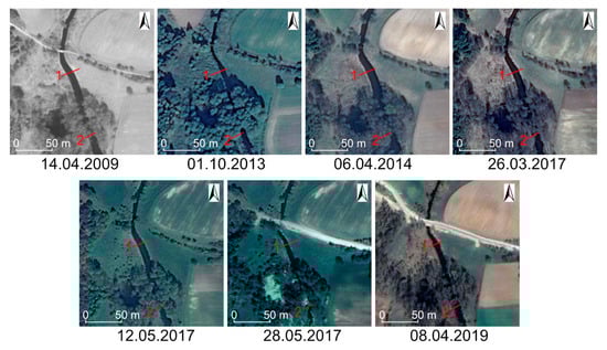 Changes of land cover and shading of the watercourse in different periods and years (images obtained from GoogleEarthPro).