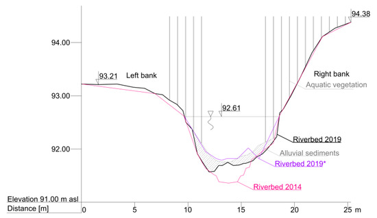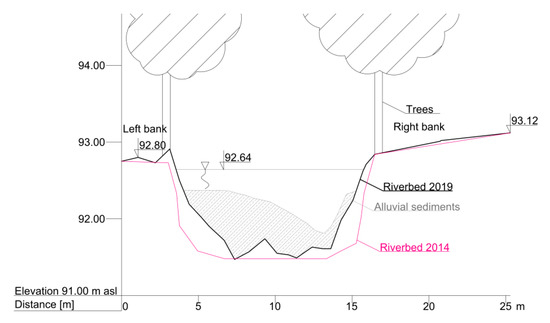 In Figure 3 and Figure 4 the cross-section was plotted for the status in 2014 and 2019. In the course of the study the cross-sections were also measured using a range pole. Cross-section 2 is wider, but slightly shallower than cross-section 1, in which, due to the bank overgrowth, flow is concentrated in the stream centerline of the watercourse. As a result of the large deposition of organic sediments the cross-sections measured using a range pole are slightly deeper (as they were probed to reach the so-called hard bottom). In this manner, the thickness of organic sediments deposited in the river channel could be assessed. Sediment thickness in cross-section 2 was much greater than in cross-section 1, with a maximum of 0.85 m. In contrast, in cross-section 1, the sediment thickness did not exceed 0.4 m. The analysis of the cross-sections also shows that within the previous five years channel shallowing was observed over the entire river reach. This trend is particularly evident in cross-section 2, where the bottom in the riverbank zone was elevated by as much as 0.6 m. Also, in cross-section 1 channel shallowing by 0.4 m was recorded. River bottom elevation and shallowing of the cross-sections may be connected with small hydraulic gradients in the investigated river reach, which is reflected in small flow velocities, at mean values for both cross-sections ranging from 0.06 m/s (cross-section 1) to 0.07 m/s (cross-section 2).