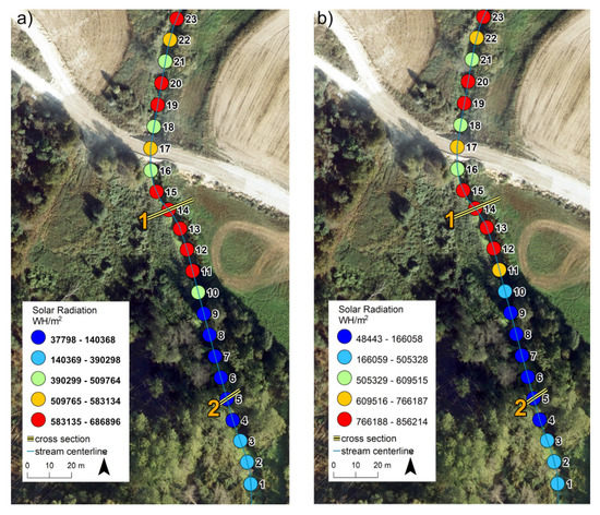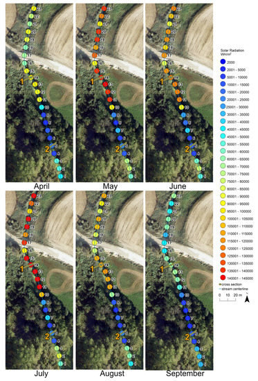 Solar radiation was calculated using the Area Solar Radiation tool in ArcGIS 10.5. The results were assigned to the points of the cross-sections of the river in the monthly configuration (Figure 5) as well as the vegetation period (Figure 6a) and annual configurations (Figure 6b).