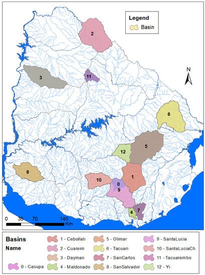 The study area covers 13 watersheds across Uruguay, having areas ranging from 300 to 5000 km2 spread throughout northern and southern regions (Figure 1). These basins were selected based on three main criteria: (i) data quality; (ii) spatial distribution; (iii) rainfall-runoff model hypothesis (Table 1). The annual mean precipitation is 1250–1450 mm in the northern region and 1050–1250 mm in the southern part. The average air temperature varies between 2 and 3 °C in northern and southern areas. In particular, in the northern regions, the average air temperature ranges approximately between 25 °C (in January) and 13 °C (in July); and in the southern areas, it ranges between 22 °C (in January) and 11 °C (in July). The relief varies between 0 m and 500 m above mean sea level (m.s.l.) in the entire country. Natural watersheds both in the southern and in the northern region are mostly covered with natural grassland (freely downloadable from the National Environmental Observatory of Uruguay (OAN) []).