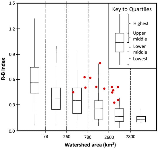 Distribution of R-B Index values for streams in six size classes of watersheds and location of the R-B index values for the 13 selected watersheds (red dots) (adapted from []).