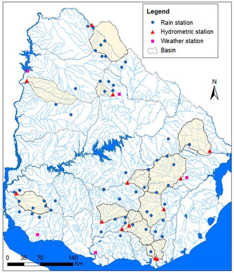 Daily streamflow data (for the period 2001–2010) from 13 hydrometric stations belonging to the Uruguayan National Water Board (DINAGUA) was used. To ensure the quality of the data collected, a consistency analysis of the water balance was carried out, taking into account precipitation, evapotranspiration, streamflow, and the calculation of the runoff coefficient.