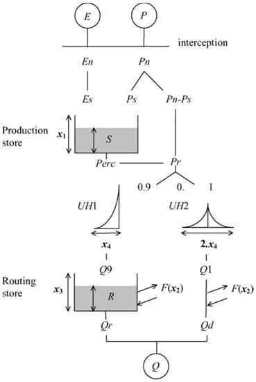 Conceptualization of the GR4J rainfall-runoff model (E: potential evapotranspiration; P: precipitation; Q: streamflow; xi: model parameter i; other letters are internal state variables) [].