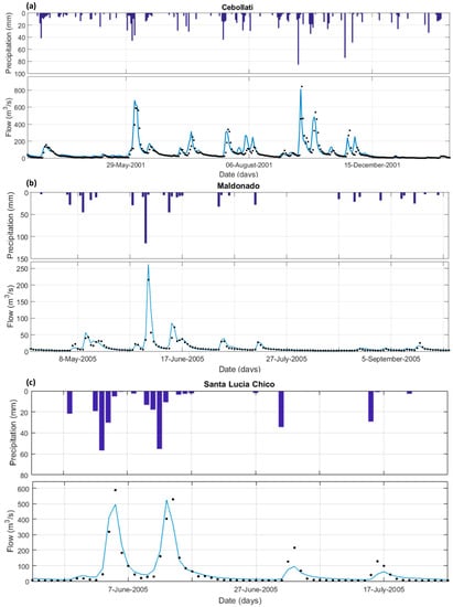 Comparison between observed (black dots) and simulated hydrograph (blue line) at (a) Cebollati, (b) Maldonado, and (c) Santa Lucía Chico watersheds.